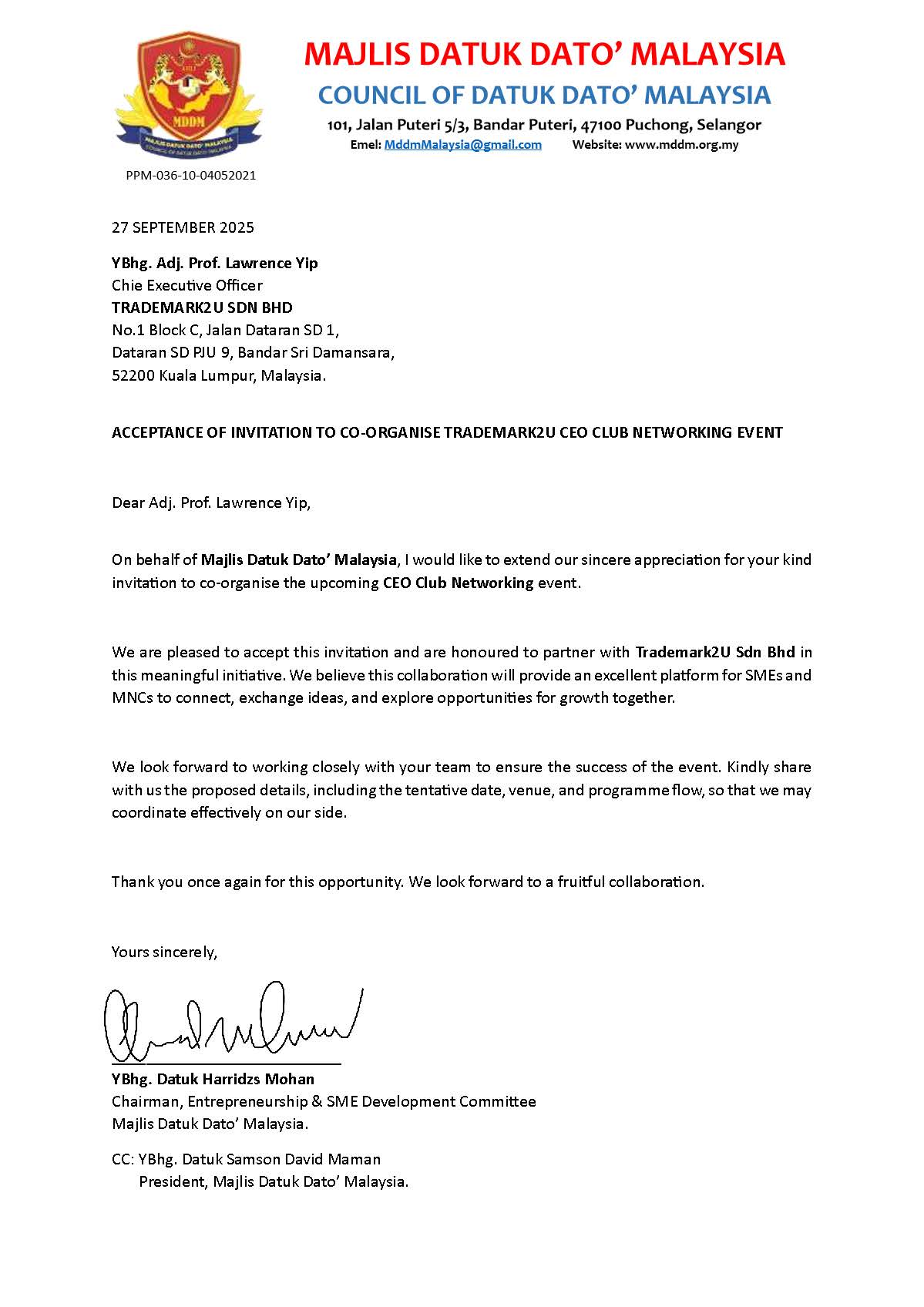 TRADEMARK2U CEO CLUB warmly welcomes Majlis Datuk Dato’ Malaysia (MDDM) as our esteemed co-organiser for the CEO Club’s Networking Events.