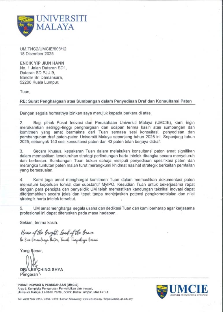 I am deeply grateful for the trust placed in me and remain fully committed to advancing innovation protection and commercialisation for Universiti Malaya and for the nation.